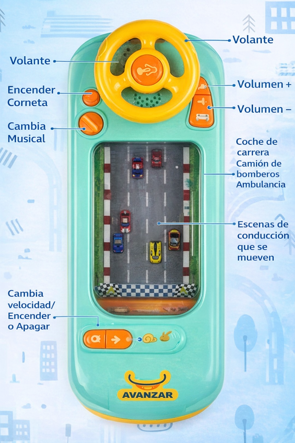 Más que un juguete, es una experiencia. Un volante interactivo que transforma el juego en aprendizaje real, creando momentos de conexión, imaginación y desarrollo lejos de las pantallas.